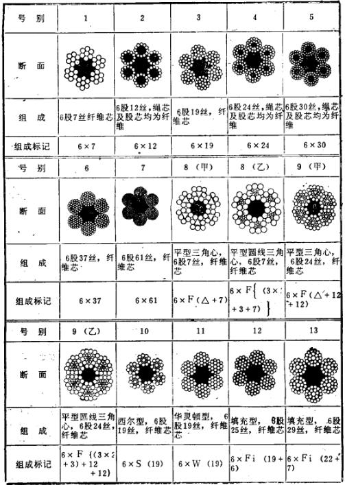 鋼繩的選用應(yīng)符合JIS G3525的規(guī)定,鋼繩的組成見表4-12,共有1-17號共17中類型,用于起重機(jī)及卷揚(yáng)機(jī)上的剛繩主要是3、6、7、10、及13號的A類。各類型鋼繩的破斷載荷及重量見表4-14/5-15及4-16.